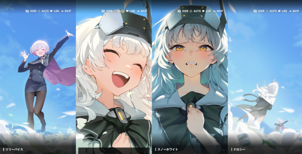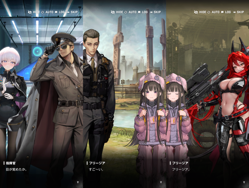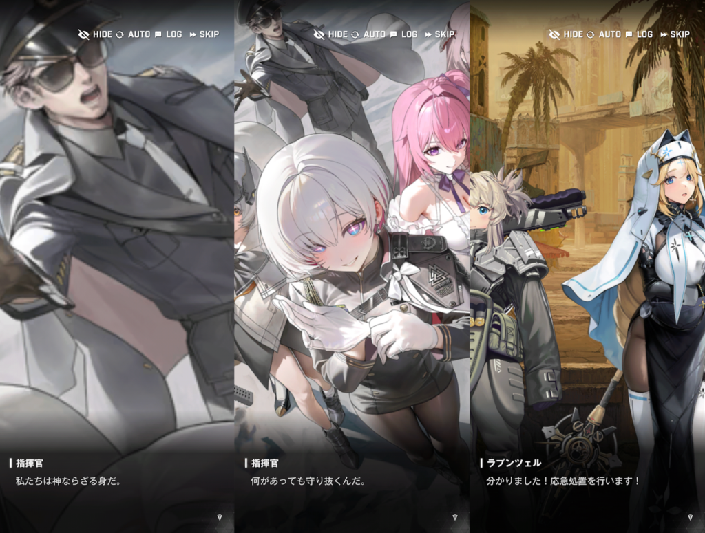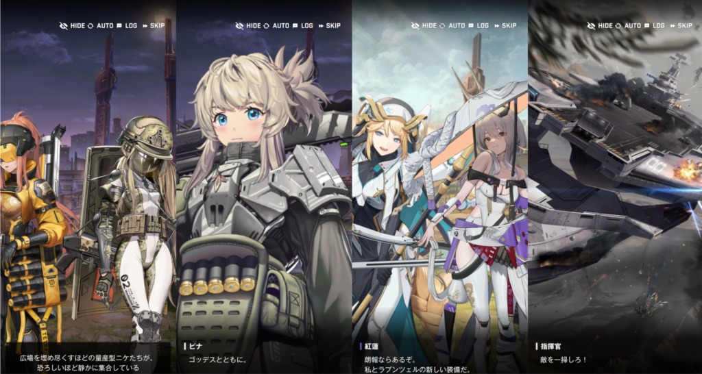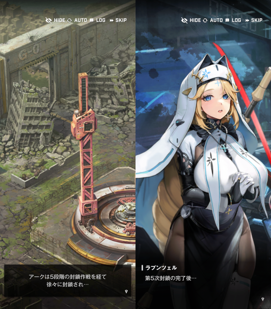 アークの封鎖が始まりました。ものすごく大きな音を立てながら封鎖されるので、ラプチャーが寄ってきてしまいます。それを撃退するのがゴッデスの役目です。アークの入り口の周りには、移動してきた人が居るテントが沢山あります。それらを守って戦おうと、指揮官は檄を飛ばしました。戦闘が始まると、リリーバイスは、ゴッデス部隊員のところを回って助けます。それぞれのいいところと、課題点を確認していきました。スノーホワイトは、火力は高いけど、想定外の事態が起こるとパニックになってしまう。紅蓮は、強いけど、考え方の柔軟性が足りない。ラプンツェルは、戦場がよく見えているけど、一人一人に感情移入してしまう。ドロシーは、戦況がよく見えるけど、人使いが荒い。というのが長所と短所です。このとき、量産型ニケのピノが出てきます。ピノは、イベントストーリーのオーバーゾーンにも出てくるキャラクターです。