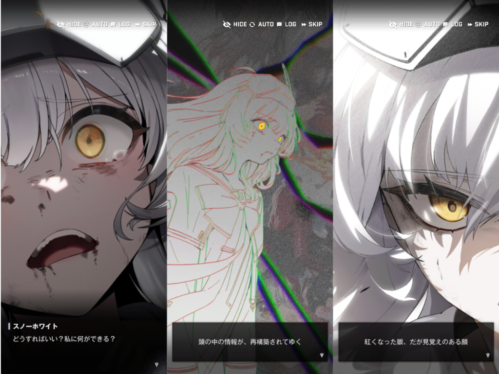 スノーホワイトが目を覚ますと、勝利の翼号が墜落していて、その現場にラプチャーが押し寄せてきていました。量産型ニケが応戦していました。ゴッデス部隊からの通信があったものの、スノーホワイトは、通信機を壊して、一人で応戦することに、迷いながら決めました。その瞬間、スノーホワイトに思考転換が起きました。