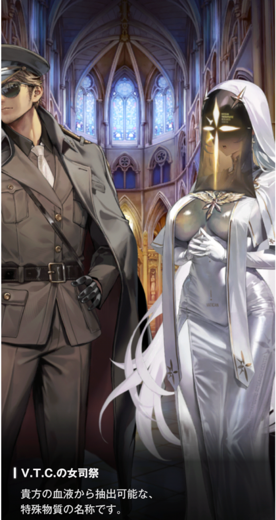 V.T.C.の研究所にて、ゴッデスの指揮官と司祭が話しています。司祭は、指揮官にアンチェインドと呼ばれる指揮官の血に含まれるナノマシンを殺す物質によってヘレティックを撃破できたこと。内臓の一部を取り出したけど一命は取り留めたことを話しました。