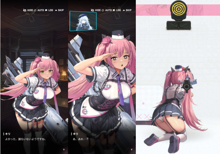 キリは、ピンク色でツインテの髪型をしています。エリシオンの所属です。超ミニのスカートを履いているので、後ろ姿は、ピンクと白の縞々のパンツが見えます。同じ部隊のミランダは、同じくミニスカなのですが、スカートの中身は絶対見えないようになっています。なぜ、この違いをつけたのかは、作者に問いただすしかありません。