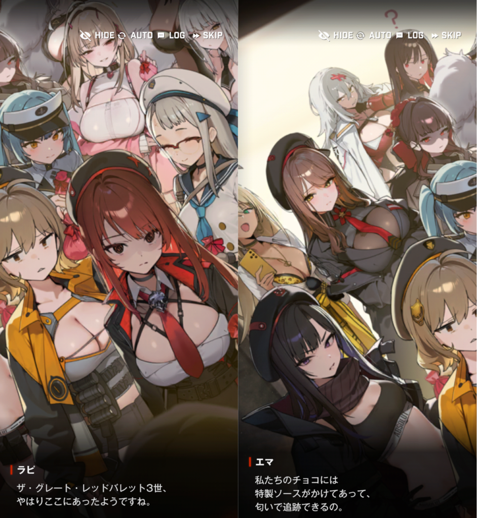 指揮官室に戻ると、回収したチョコレートを並べました。クラストとデルタとともに、作戦の成功を喜びます。しかし、結局全てのチョコレートは、指揮官のために作ってあったので、わざわざ回収する必要がなかったとことに気づきます。クラストとデルタが帰った後、指揮官室で休んでいると、チョコレートを回収したニケ達が全員で指揮官室にやってきました。全員に勝手に回収し、クラストのチョコレートをおいて行ったことを責められました。全員にチョコを食べるように強要されて、お腹を壊すまでチョコレートを食べるはめになりました。おしまい。