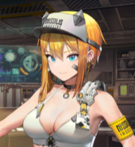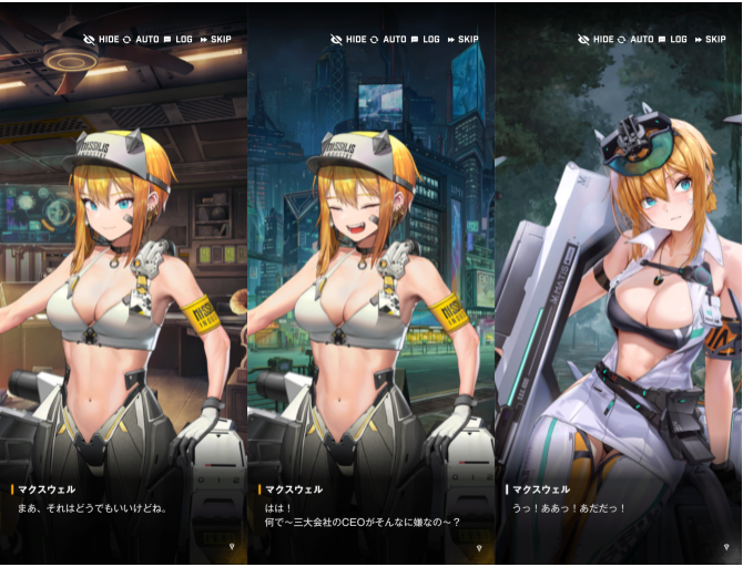 マクスウェルは、金髪のショートカットで、サンバイザーをつけています。上半身は水着のビキニで、下半身は長ズボンの水着みたいなのを着ています。下半身に謎の機械をまとっています。尻尾みたいな線が伸びていて、スナイパーライフルにつながっています。主人公のことをベビーと呼びます。メティス部隊のツッコミ担当で、常識人です。物語が進むと、武装をパワーアップします。見た目のコンセプトは、そのままで、金髪ショートにバイザーです。そして、おっぱいはしっかり出してます。