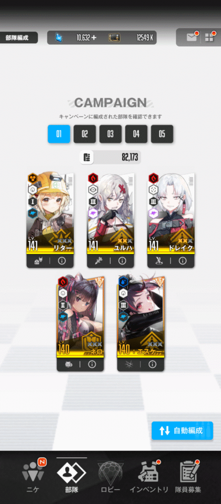 デイリー消化を行い、ユニオンレイド、イベントクエストをやりました。レベル140を超えたニケは、今のところ3体、あと2体ですね。もう少し!キャンペーンは、緊急招集を3体使って3個進めました。