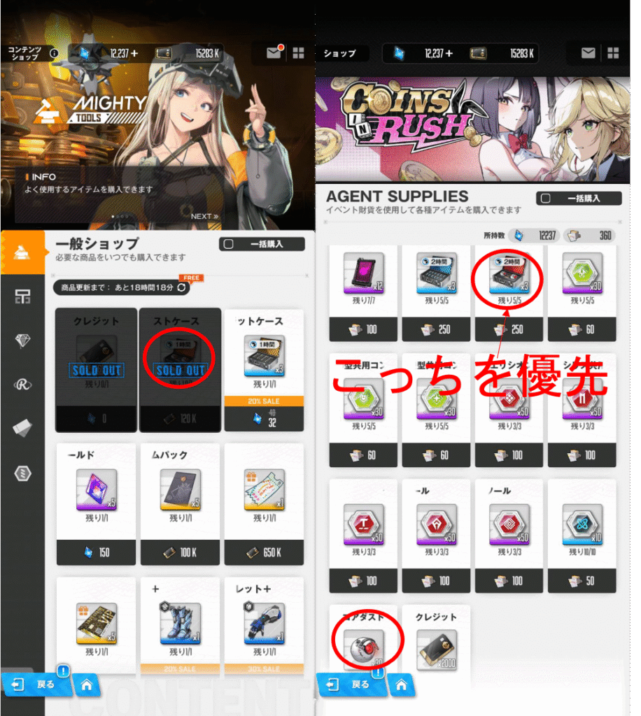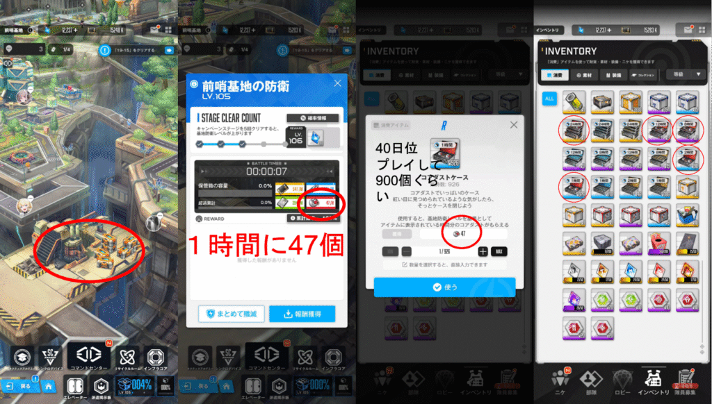 コアダストを集めるのは、基本的には前哨基地にある前哨基地の防衛という、いわゆる放置報酬から獲得することになります。この放置報酬の量は、基地レベルが上がると多くなります。基地レベルは、キャンペーンをnormalやhardをどれだけ進められたかによって上がっていきます。レベル105なら、コアダストは1時間に47個入手できます。また、コアダストの入手方法としてコアダストケースがあります。このコアダストケースは、放置報酬と同じ数コアダストが手に入ります。なので、私の場合は1時間のコアダストケースだと、47個コアダストが手に入ります。コアダストケースには、1時間、2時間、8時間、12時間、24時間があるようです。他にもあるかもしれませんが、私は持っていません。入手できるコアダストケースは、ほとんどが1時間のものです。私の場合はプレイして43日で、大体900個位手に入れています。コアダストケースの入手先は、主に、一般ショップとイベントクエストの交換です。画像を乗っけているので、参考にして下さい。