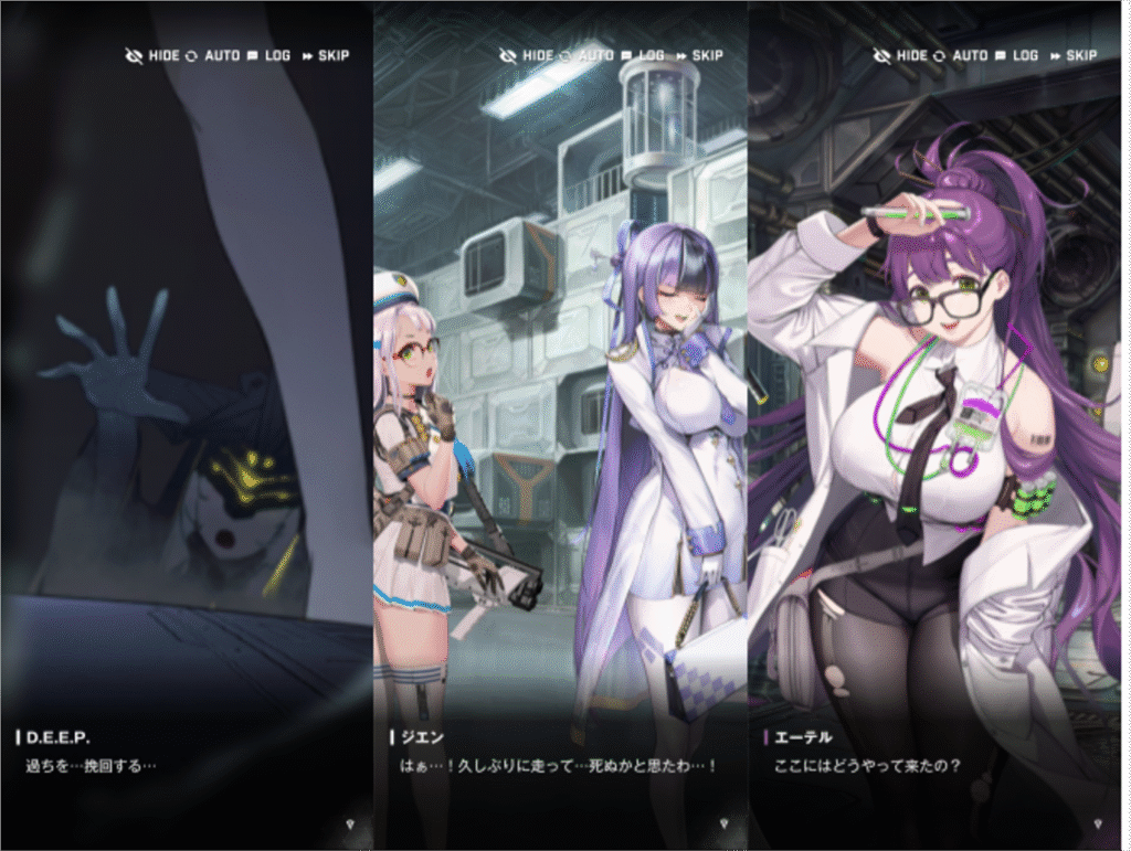ネオンは、エレベーターからおりて進むと、エレベーターと同じPと書かれた扉がありました。電子ロックに顔を認証させると扉が開きました。真っ暗な部屋の中には司祭服を着た沢山の人が、鍵をもっている者よDEEPに栄光をといいながら迫ってきます。照明弾を打ち上げると司祭服の人は逃げていき、ジエンというニケがいました。ジエンはネオンの眼鏡をとりあげ、これをどこで手に入れたか?と問われます。ジエンは、シュエンの姉でした。研究所にて、エーテルとジエンと話します。ネオンは、ニケになる前の記憶が一切なく、メガネはニケになった時から持っていいたといいます。ネオンは、薬を守られて倒れてしまいました。