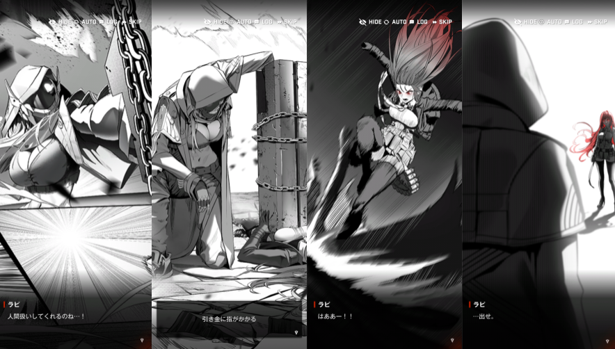 確認したラピは、グレイブを詰めます。ラピは、髪が赤くなりレッドフードモードになり、グレイブを撃退しますが、グレイブは逃げてしまいます。安定して高出力を出せるようになったようです。