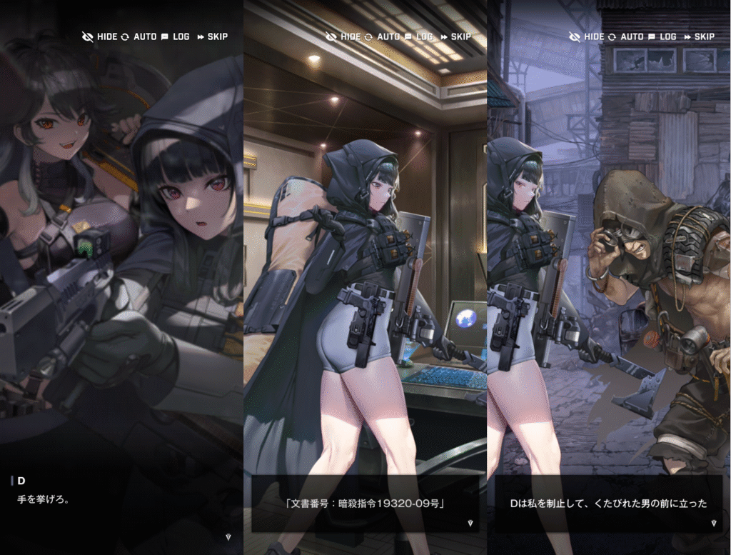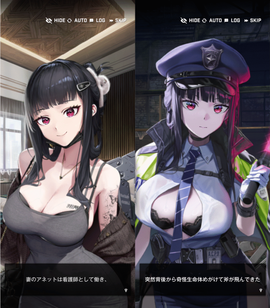 Dは、いかにも諜報部隊員の出で立ちです。上半身ボディスーツで、肌の露出はありません。ロングヘアですが、フードを被っているので、普段は見えません。斧を持っていて、何かあるとすぐに斧で襲いかかってきます。Dは、ジャッジスの指令で動くものの、自分の正義を優先し、時にはジャッジスの指令に反する行動をとります。また、Dは、意外と常識的な感覚を持っていて、空気が読める優秀なやつです。指揮官との出会いは、マリアンを部隊に加えた際に、追手として現れました。バイオハザードコラボイベントでは、新しいコスチュームのキラーワイフが出てきました。通称、嫁D胸元が大胆に開いた服で、乳だししています。露出が低いキャラは、脱がされる運命にあるのでしょう。また、諜報員つながりで、バイオハザードコラボでは、エイダとの組み合わせにしていると考えられます。またコラボでは、ポリス姿もお披露目されました。